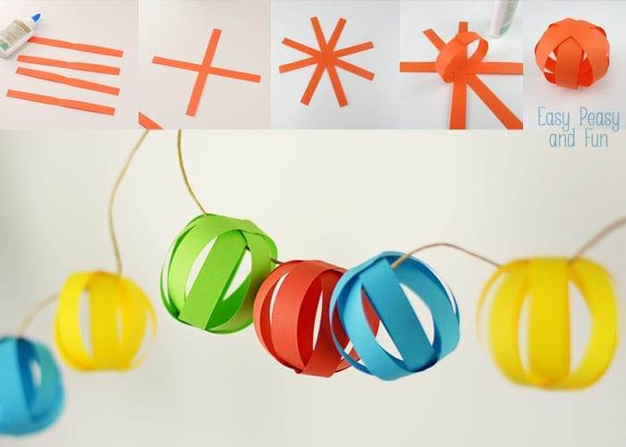 Веселая гирлянда с бумажными шариками сразу же привнесет атмосферу праздника в помещение. Возьмем 4 бумажные полоски одного цвета и перекрестим их. Сворачиваем противоположные концы каждой полосы и склеиваем. То же проделываем с остальными полосками, пока не получится объемный шар. Количество шариков зависит от желаемой длины украшения. Можно использовать то же сочетание цветов, что и на картинке, или создать гирлянду под цвет своего интерьера.