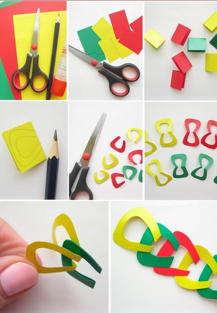 Из обычной цветной бумаги нарезаем прямоугольники одинакового размера. Сгибаем их пополам и рисуем фигуру в виде подковы. Вырезаем заготовки с помощью ножниц. Когда готово достаточное количество деталей, продеваем их друг в друга, чередуя разные цвета.