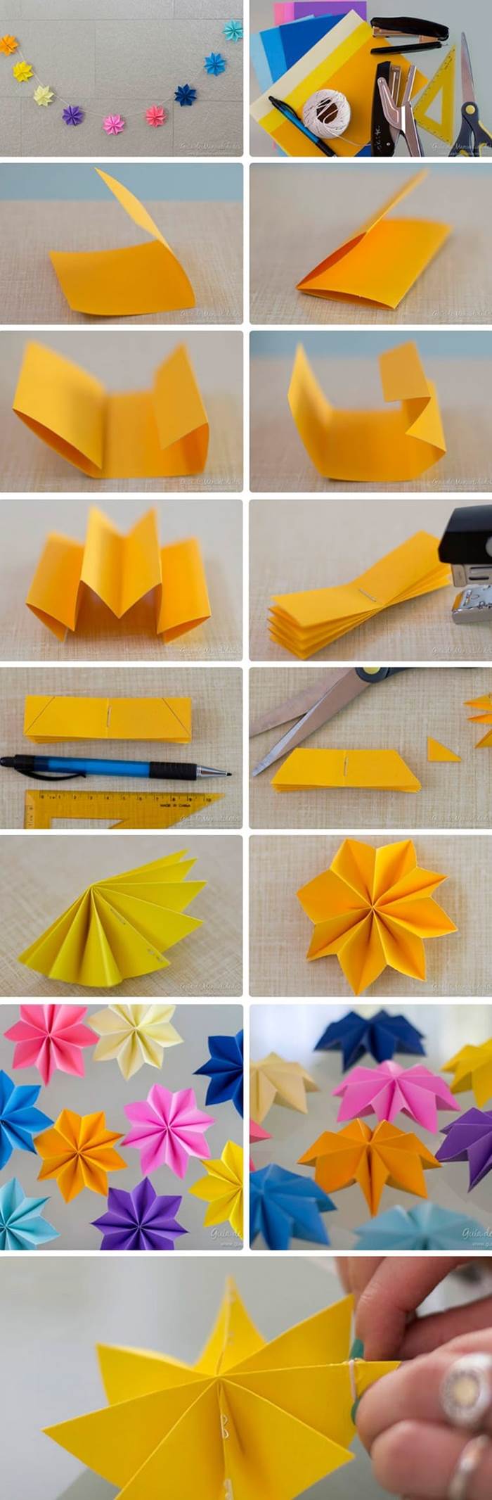Украшение из ярких цветов будет выигрышно смотреться на однотонной стене. Складываем оранжевый лист пополам. Правую и левую сторону мысленно делим на две части и сгибаем боковые сторону внутрь. Каждую сторону снова делим пополам. Продолжаем сгибать бумагу до тех пор, пока не образуется гармошка. Складываем ее в линию и скрепляем степлером по центру. С двух сторон отрезаем уголки. Раскрываем гармошку и соединяем концы, чтобы получился цветок. Нанизываем цветы на тонкую веревку или леску.