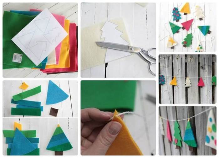 Простые, но в то же время очень красивые елочки подойдут для интерьера в стиле минимализм. Вырезаем фигурки про приготовленным ранее шаблонам. Каждую из них декорируем фетром разных цветов. Прикрепляем елочки на белую нить. Осталось повесить декорацию в подходящее место.