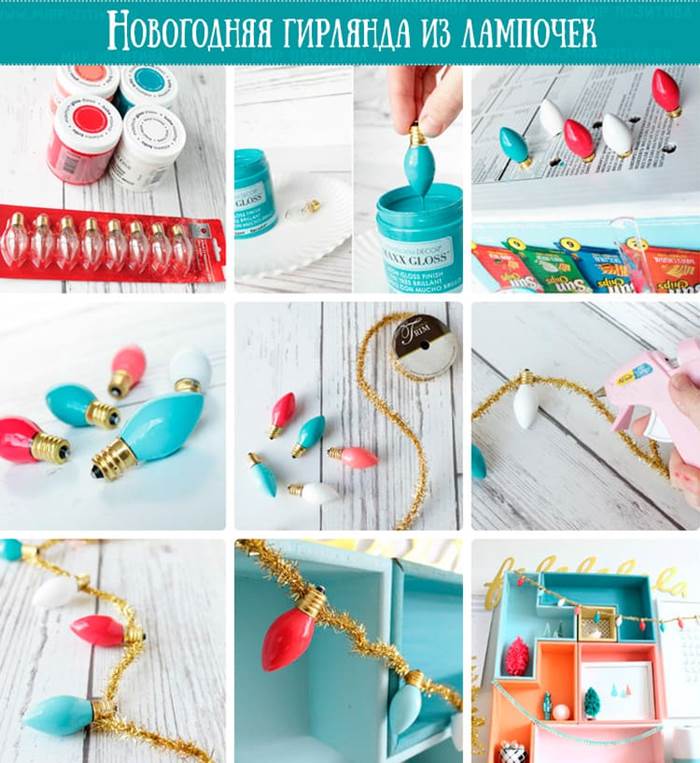 Сделать такую стильную гирлянду совсем не сложно, зато результат превзойдет все ожидания. Подготовим лампочки продолговатой формы, синельную проволоку или ленту, глянцевую краску и клей-пистолет. Поочередно окунаем лампочки в банку с краской. Их стоит погружать очень осторожно, чтобы случайно не покрасить цоколь. Оставляем лампочки сушиться. Для удобства можно сделать отверстия в ненужной коробке и поместить их туда. Когда заготовки полностью просохли, приклеиваем их к длинной ленте. Новогодняя декорация готова!