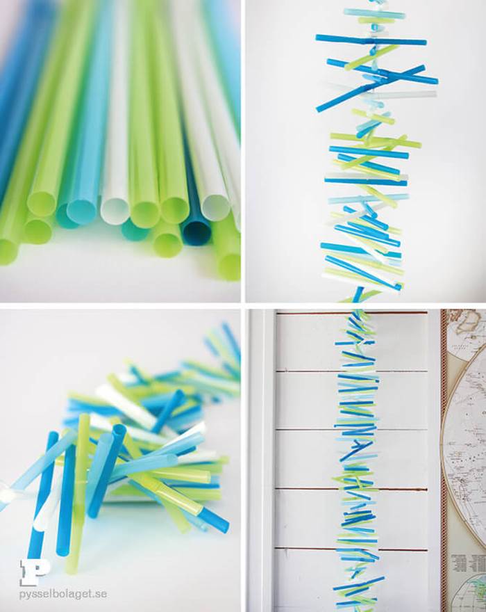 Довольно необычная вертикальная гирлянда получается из коктейльных трубочек. Необходимо сделать отверстия в центре каждой трубочки и продеть их через леску, чередуя голубой, синий, белый и зеленый цвет.