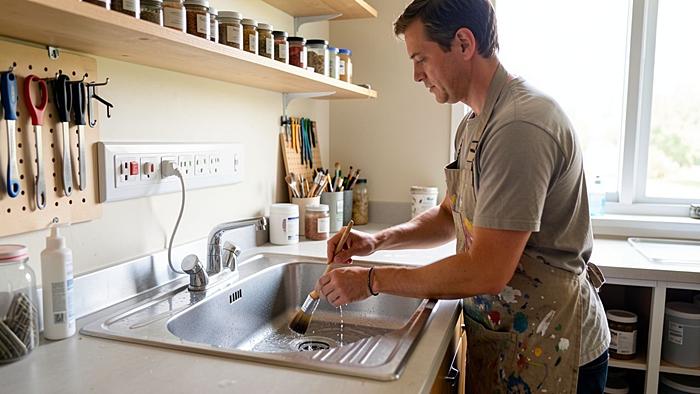 Обеспечьте постоянный приток влаги в рабочую зону, установив отдельный кран с холодной и горячей жидкостью. Это позволит мгновенно ополаскивать кисти, валики, емкости и другие приспособления после их использования, предотвращая засыхание красок, клеев или глины. Располагайте смеситель на удобной высоте, чтобы избежать неудобств при работе с крупногабаритными предметами.