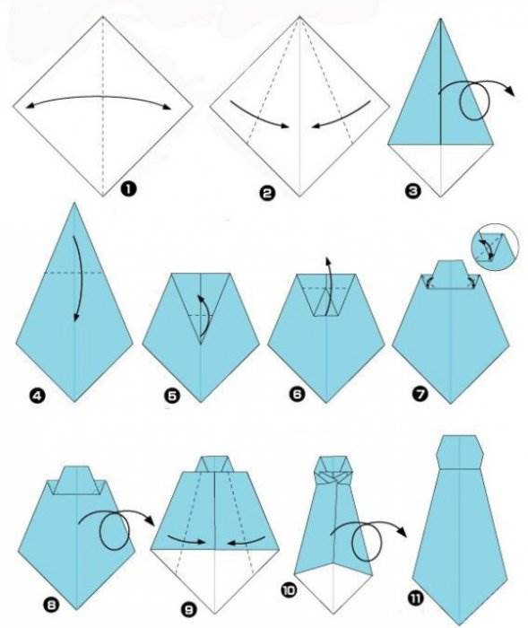 Галстук. Для изготовления галстучка есть схема. 1. Нам понадобится небольшой квадратный листочек. У меня 6 х 6 см. Сгибаем его по диагонали, разгибаем. З...