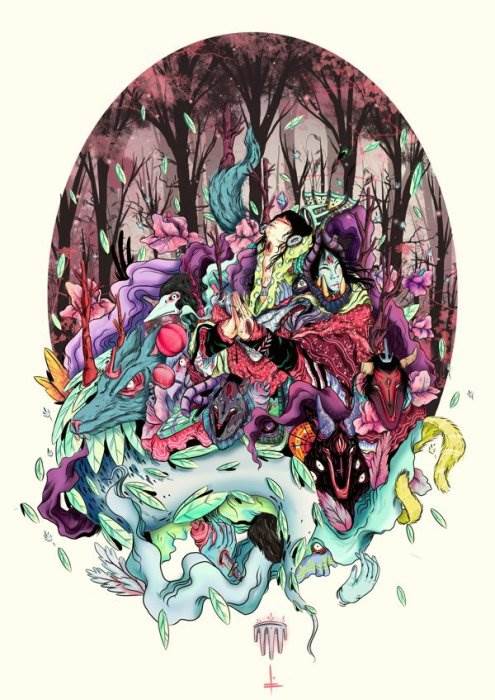 Первое впечатление от этих работ — мешанина цветов и образов, странные химеры, инфернальные чудовища с кабалистическими знаками и т.д. Присмотревшись повниматель...