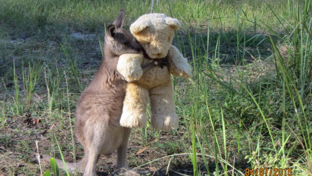 Сирота кенгуру нашёл утешение в плюшевом медведе